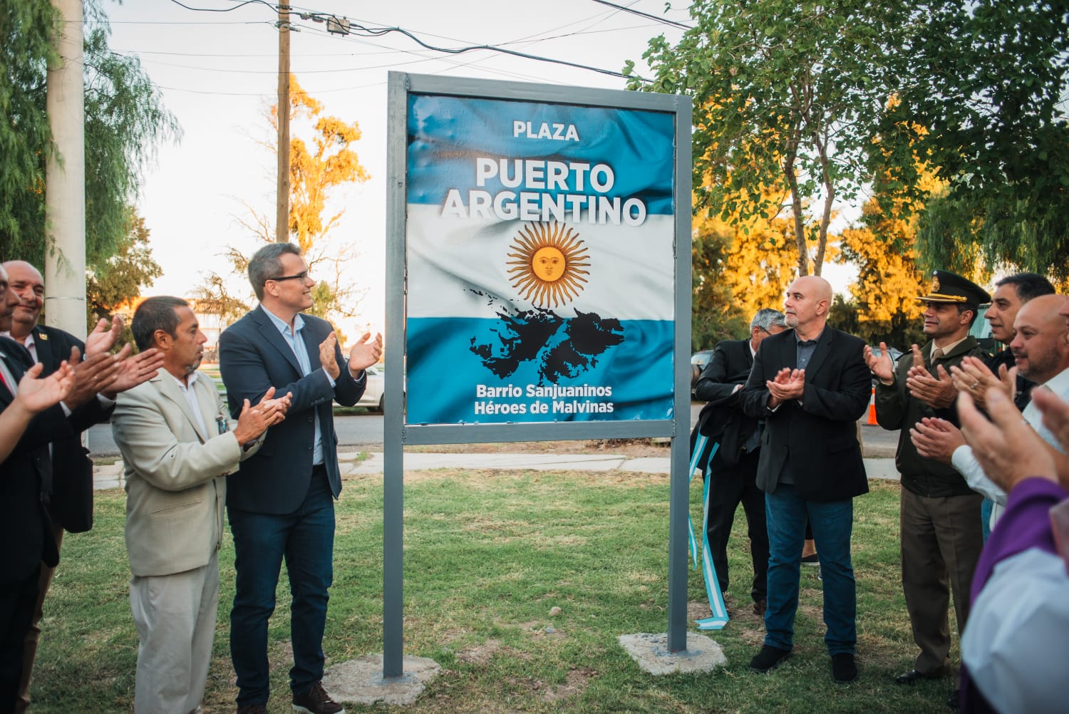 El intendente se mostró honrado en “poder dirigirme en este día tan especial y en este lugar tan simbólico y tan importante como lo es esta plaza cuya placa vamos a descubrir y que recibe el nombre de Puerto Argentino y de este barrio que simboliza la gesta heroica que sanjuaninos como los que hoy tenemos aquí presentes y argentinos llevaron adelante aquel 2 de abril cuando desembarcaban en nuestras islas, en nuestro suelo argentino hace 42 años”.