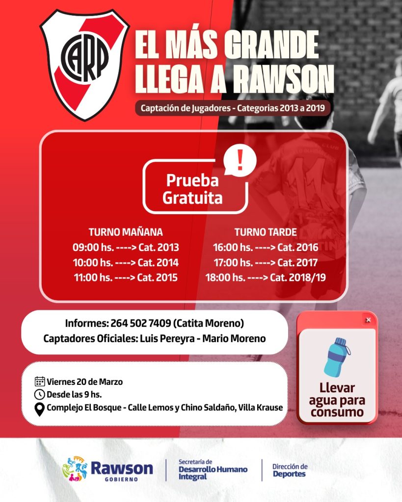 La pasión por el fútbol se vive con fuerza en nuestro departamento. La Municipalidad de Rawson, bajo la coordinación de la Dirección de Deportes, dependiente de la Secretaría de Desarrollo Humano Integral, se enorgullece de anunciar una jornada exclusiva de captación de jugadores por parte del Club Atlético River Plate.